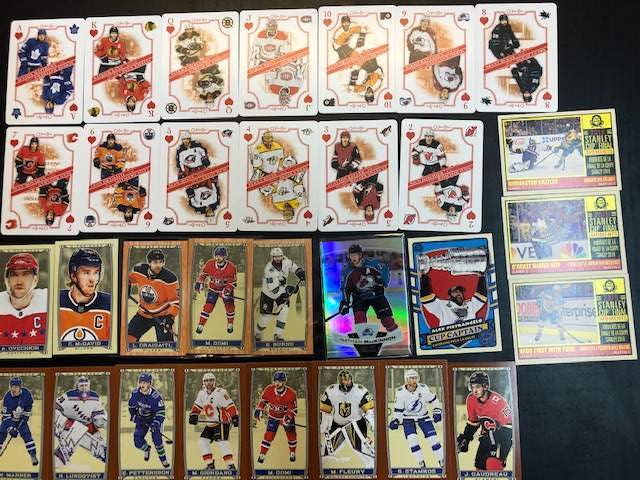 Série má jako již tradičně 600 základních karet 500 tzv. Veterans, 501-550 Rookie, 551-582 checklist loga, 583-600 season leaders a season highlights. Tyto karty můžete naleznout v balíčkách v těchto variantách: Base, Blue Border, Gold Glossy, Retro, Retro Black /100, Retro Blank Back. Dále můžete naleznout v hojném počtu v balíčku inserty Playing Cards a Mini´s karty i v těchto insertních setech jsou však short printy(SP) a super shortprinty (SSP) u mini jsou varianty Wood a blank back. Nejvzácnější a v průměru na každý druhý box jsou Trophy materials patch, In Action, Cup Captain ( pouze jedna karta Max Pacioretti), Hall of Fame team Logo patch update. Dále se v blaster boxech vyskytuje barevná varianta Mini karet tzv. Caramel, těch jsem také pár otevřel, aby se neřeklo a zatím jich ještě dost chybí ( je v průměru 1-2 na blaster box).